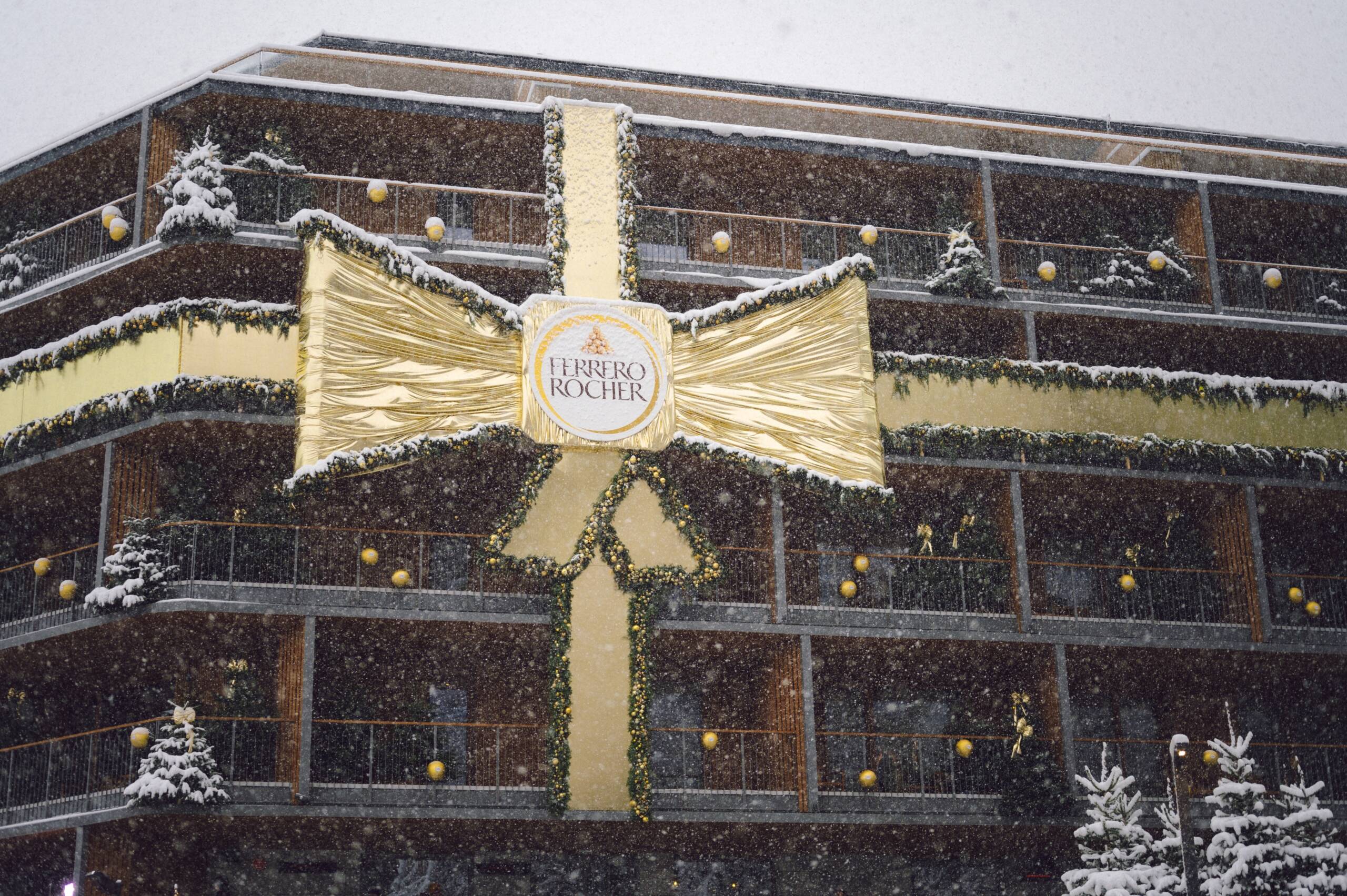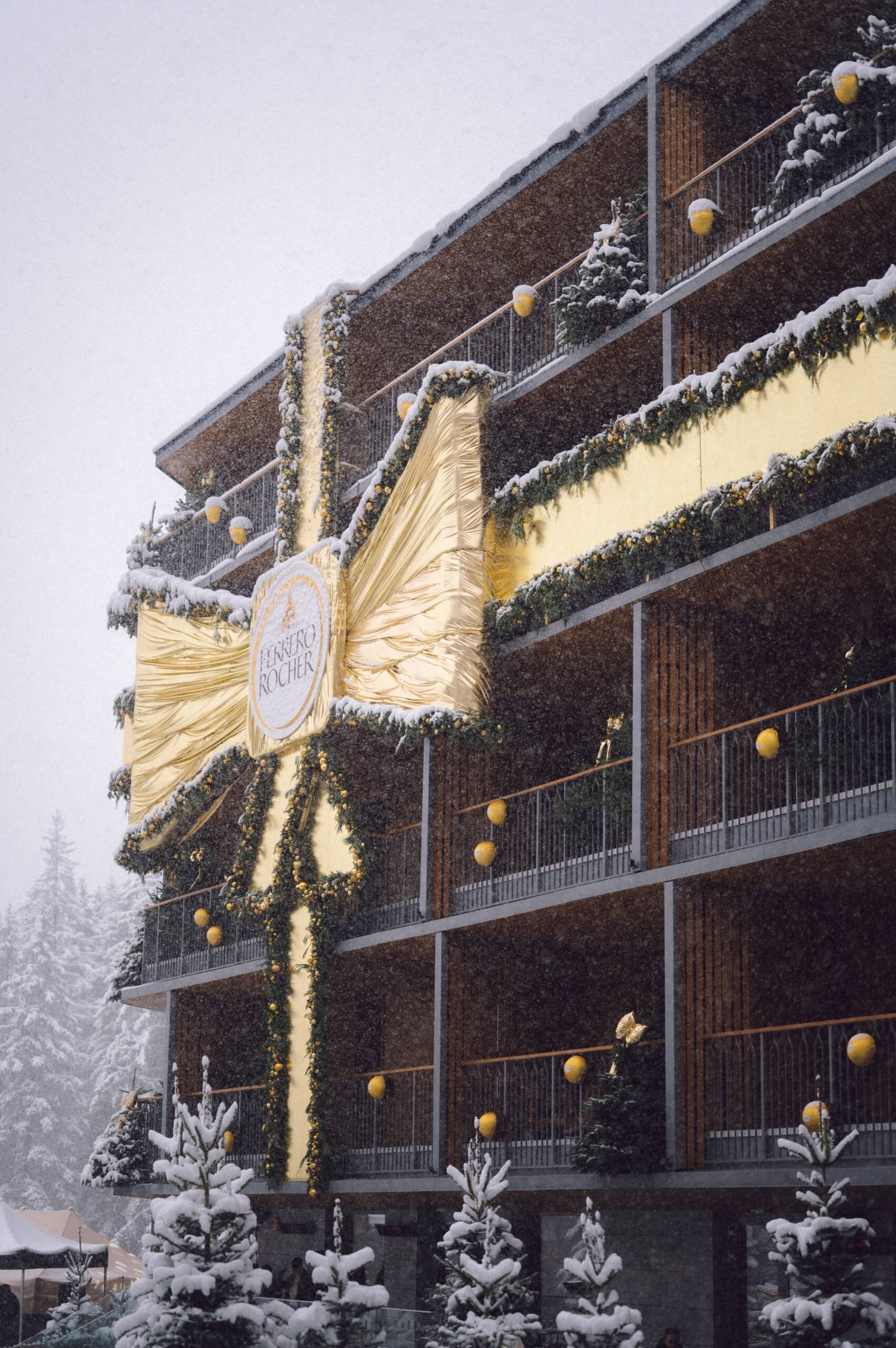 In Zusammenarbeit mit Ferrero Rocher wurde die Fassade des Swissôtel Poiana Brașov in ein visuelles Geschenk verwandelt – mit einer monumentalen goldenen Schleife, 120 natürlich eingebundenen Tannenbäumen und Lichtinstallationen, die im Einklang mit der Architektur pulsieren.