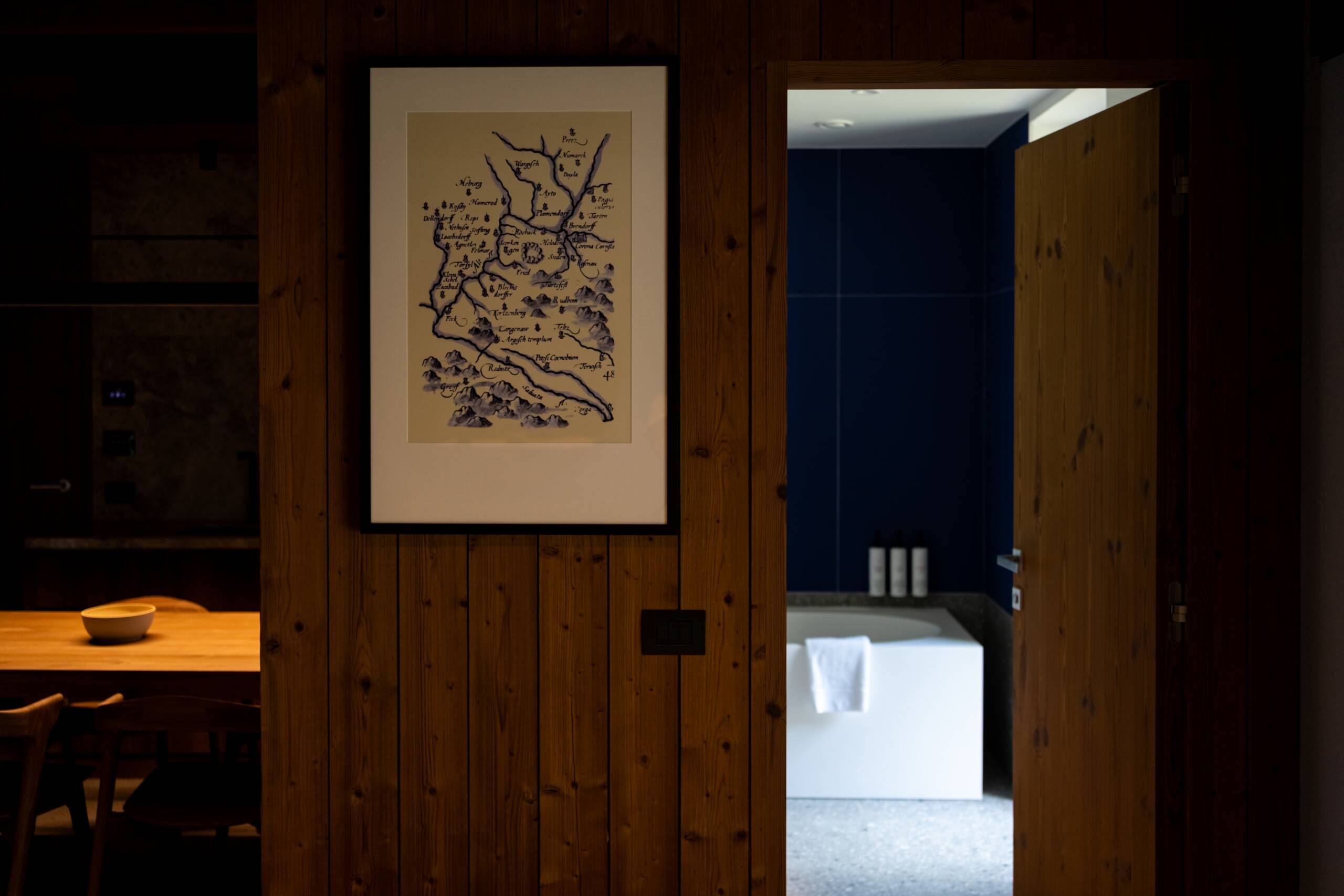 Die Hotellobby präsentiert eine einzigartige künstlerische Interpretation der Marken-Kartografie – ein visuelles Erlebnis für Gäste, das bereits beim Eintreten beeindruckt.