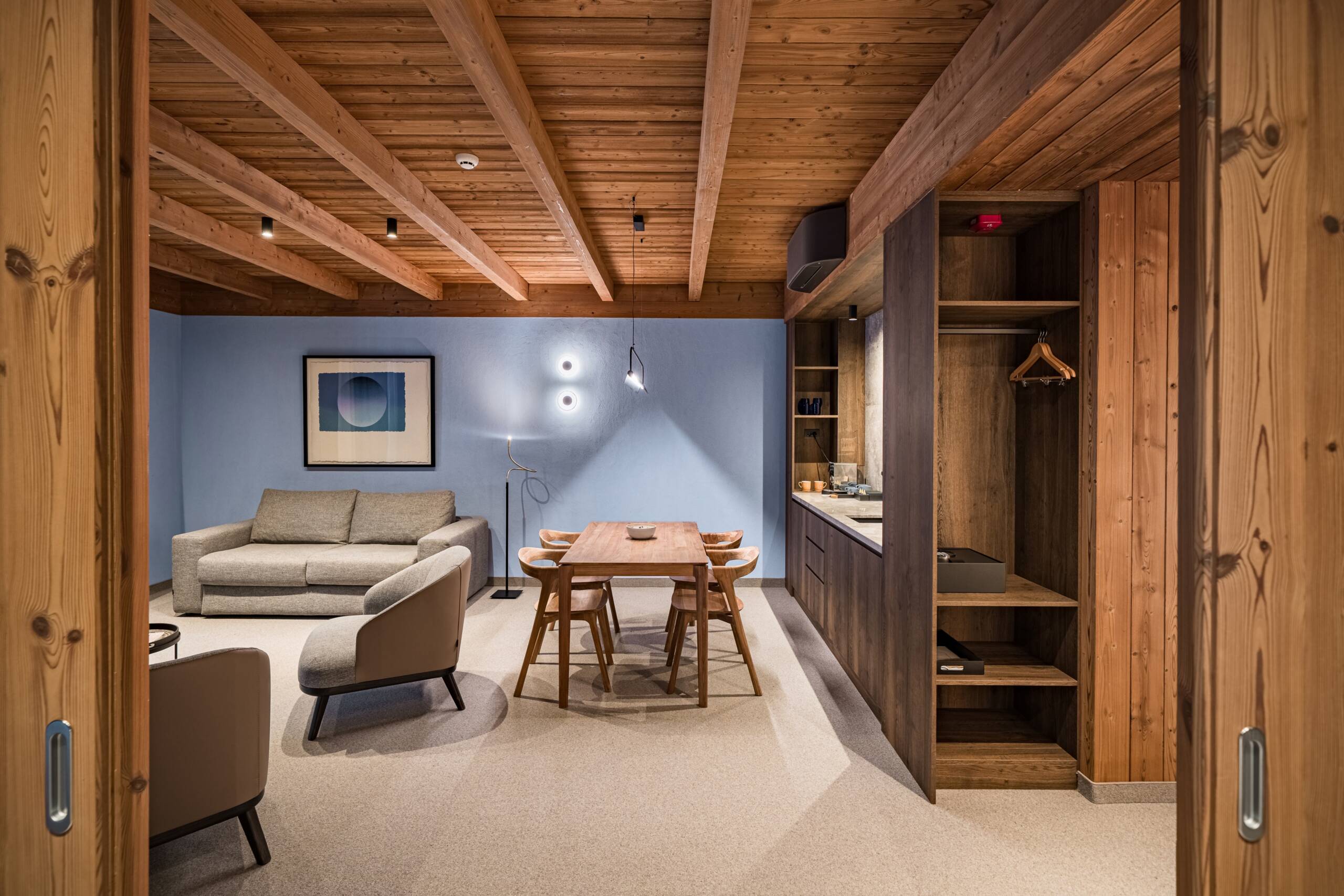 Der multisensorische Duft im Hotel, der bereits beim Betreten des Aufzugs wahrnehmbar ist, ist ein wesentlicher Bestandteil der entspannenden Atmosphäre im Swissôtel Poiana Brașov. Das im Design verwendete Holz ist Lunawood – thermisch modifiziertes nordisches Kiefernholz aus nachhaltiger Herkunft. Das patentierte thermische Modifikationsverfahren verleiht dem Holz eine außergewöhnliche Haltbarkeit und Stabilität, während es einen natürlichen, waldähnlichen Duft mit Noten von Honig und Blumen bewahrt. Thermoholz wird häufig in umweltfreundlichen Architekturprojekten verwendet, da es witterungsbeständig und nachhaltig ist. Die Wandverkleidungen in den Zimmern bestehen aus rustikalen Luna Layer-Profilen.