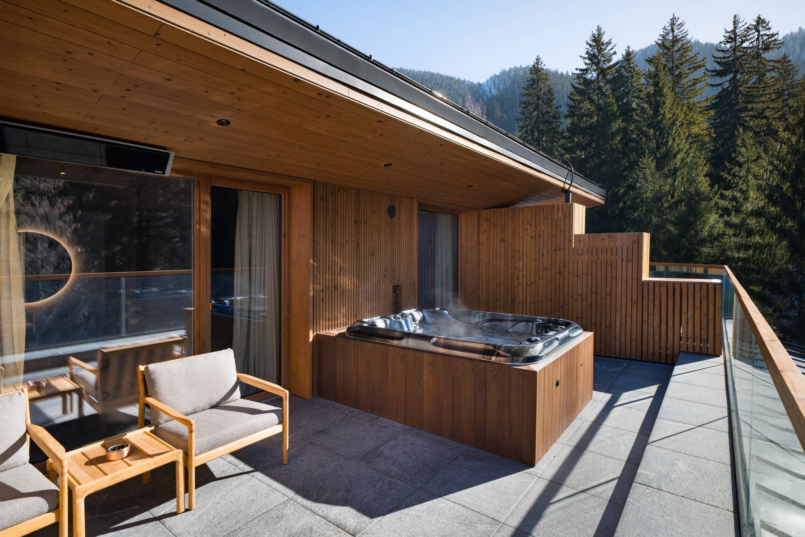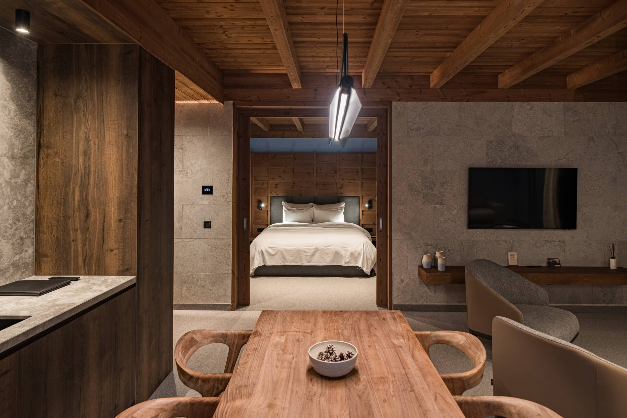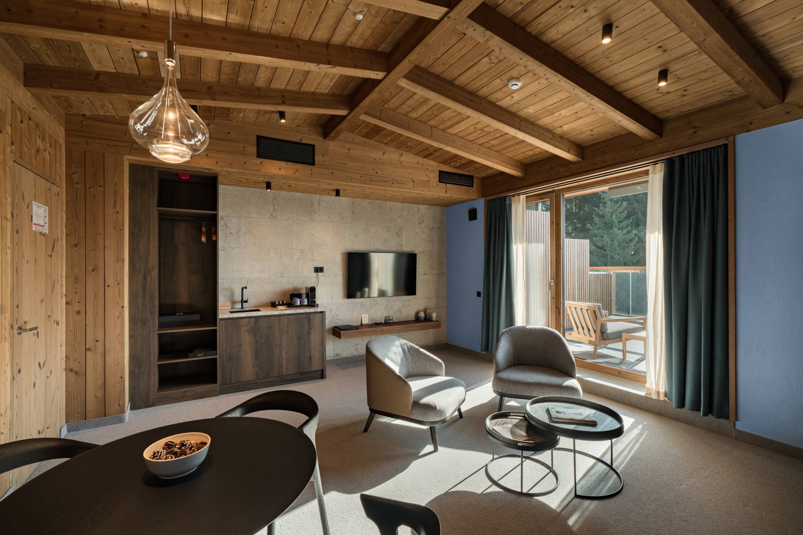 MIirosul multisenzorial din hotel, perceptibil imediat ce pășești în lift, este o componentă esențială a atmosferei relaxante de la Swissôtel Poiana Brașov. Lemnul folosit în design este un pin nordic modificat termic, provenit din surse sustenabile. Procesul brevetat de modificare termică oferă lemnului o durabilitate și stabilitate excepționale, păstrând în același timp un parfum natural, asemănător pădurii, cu note de miere și flori. Thermowood este adesea folosit în proiecte arhitecturale ecologice datorită rezistenței sale la condiții meteo severe. Lambriurile din camere sunt realizate cu profile rustice Luna Layer.